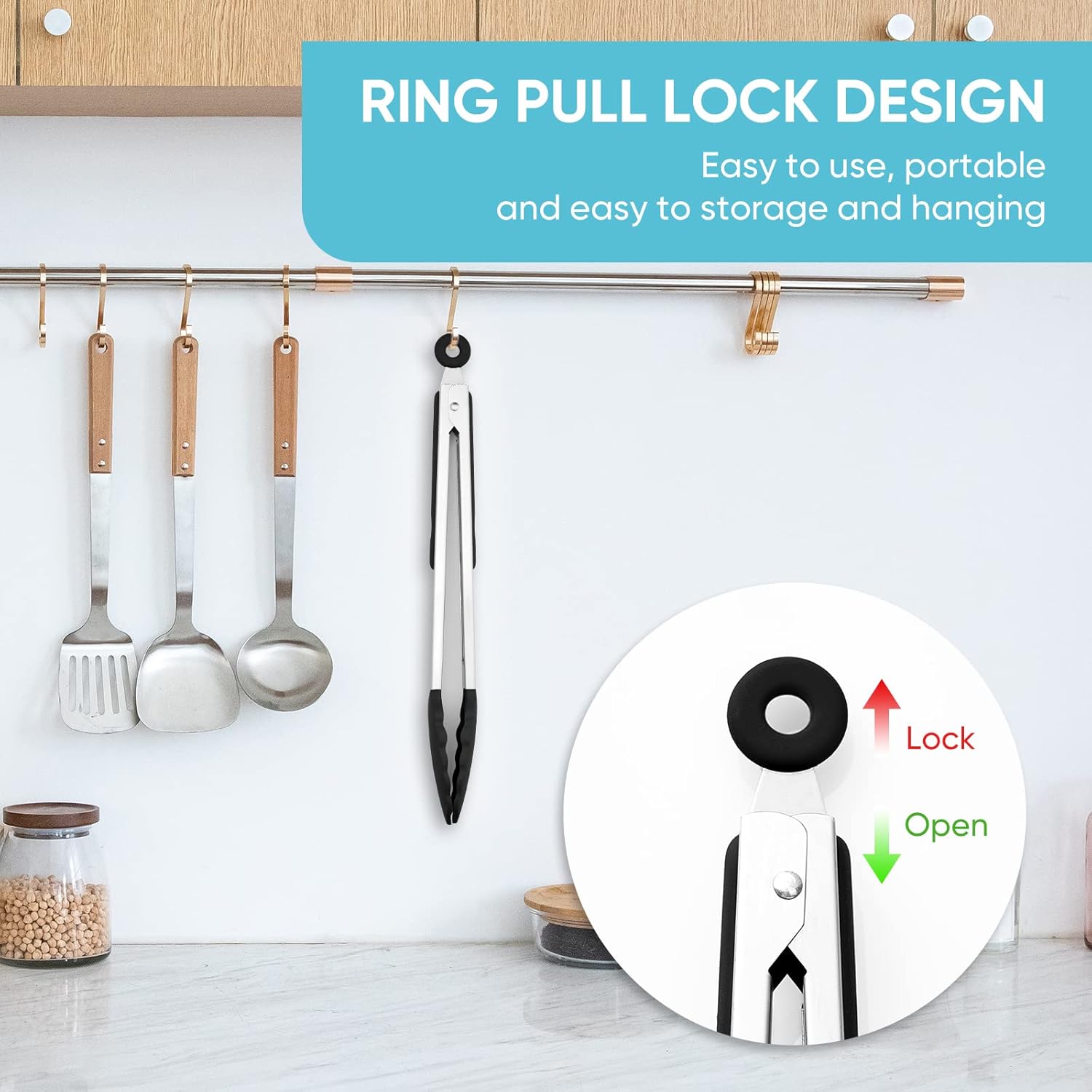 • LOCKING MECHANISM & EASY TO USE:These kitchen tongs stainless steel feature a locking mechanism which is made to last,pull the ring for lock and push for unlock,super easy operation.Hang the rubber tongs with the hanging loop after use or put in the drawer by pulling the ring to lock it,space saving.Easy to clean and safely use for dishwasher.
