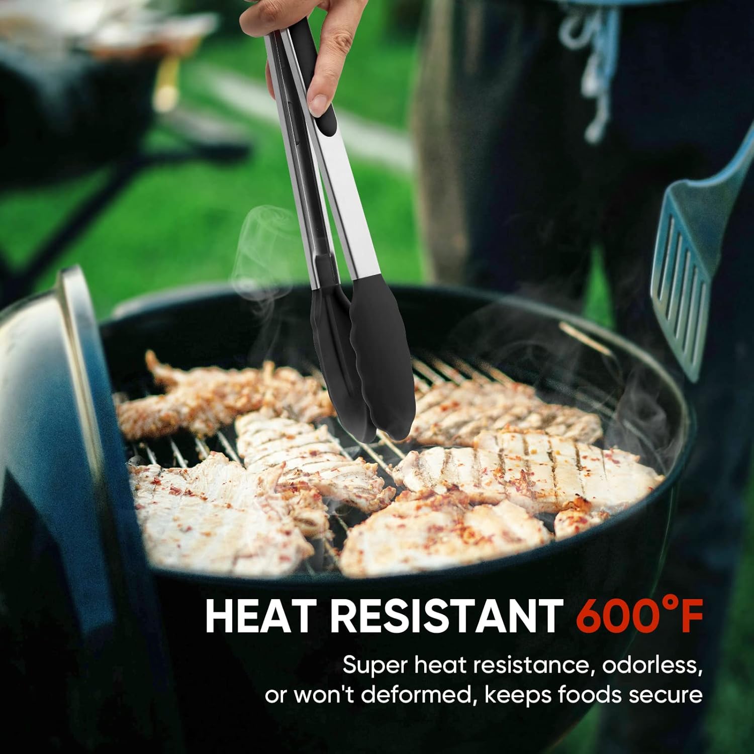 • COMFORTABLE HANDLES: Our grilling tongs grip,flip,move,and jostle foods with great precision.While also keeping its lightweight and beneficial ergonomic characteristics!Smooth rounded handles with soft TPR material for a firm,comfortable grip.The upgraded concave stainless-steel handle edge of grill tongs can prevent possible injuries when holding the handle.Keeps hands safe and foods secure.