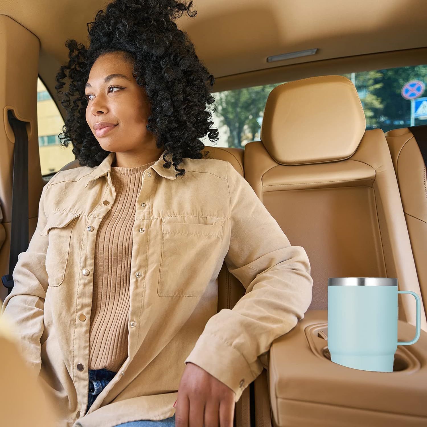 • Cupholder Friendly: The travel coffee tumbler 20oz is designed with a tapered shape which fits most car cup holders, equipped with a sturdy handle that allows easy carrying. Diameter 3.38" large cup mouth makes it easier for you to clean the stainless steel mug