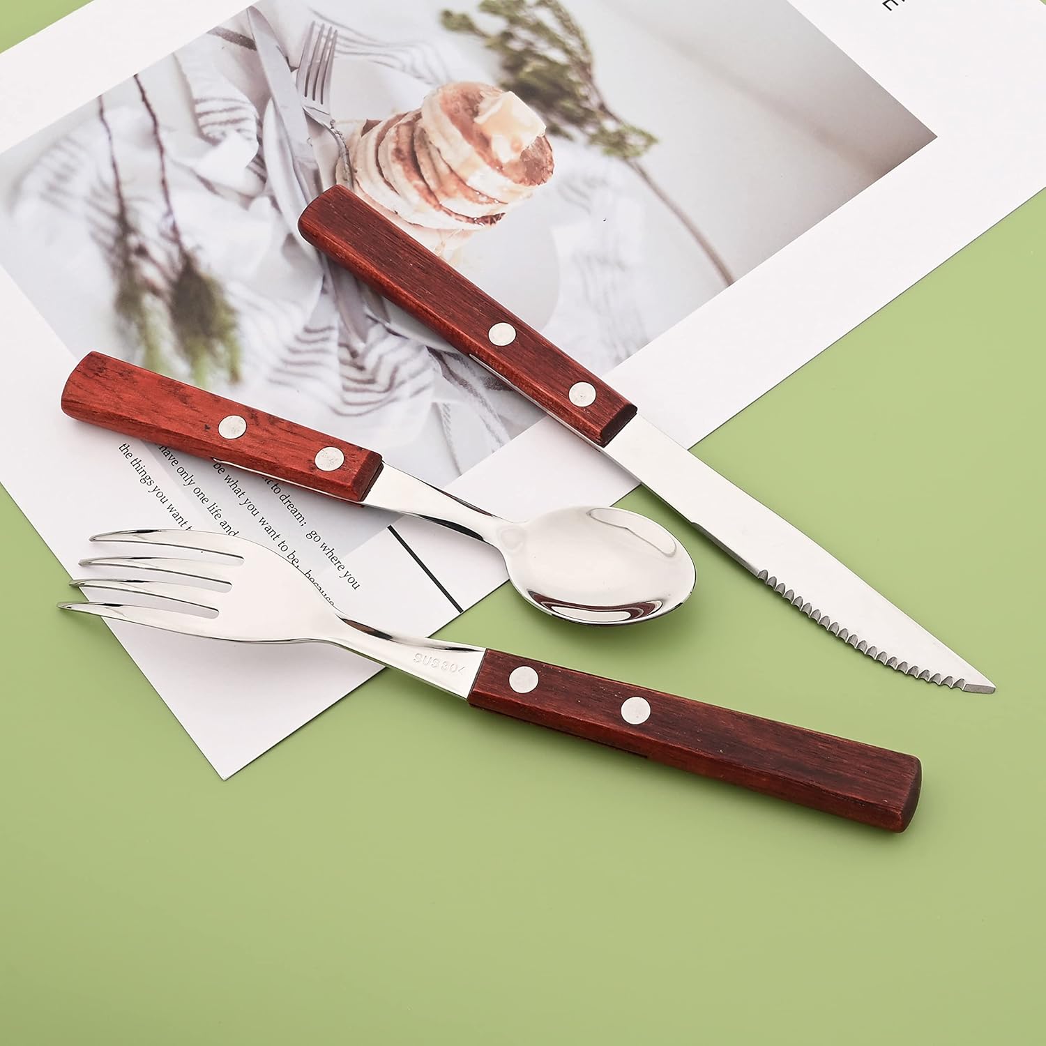 • FINE RIVET CRAFTSMANSHIP: Ergonomic square wood handles are designed with rivet, complement each other with food and make dining more elegant.