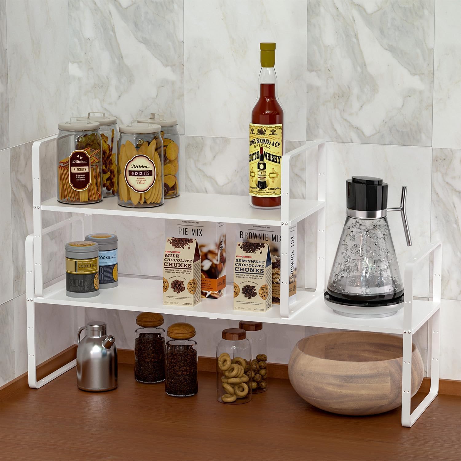 • 【Multi-purpose Use】 - Metal Expandable Stackable Cabinet shelves instantly create additional storage space. Perfect for any pantry or for placing dishware on, they can be placed inside a cabinet or on a kitchen countertop. It's ideal for organizing all your dishware, kitchen accessories, canned goods, and more!