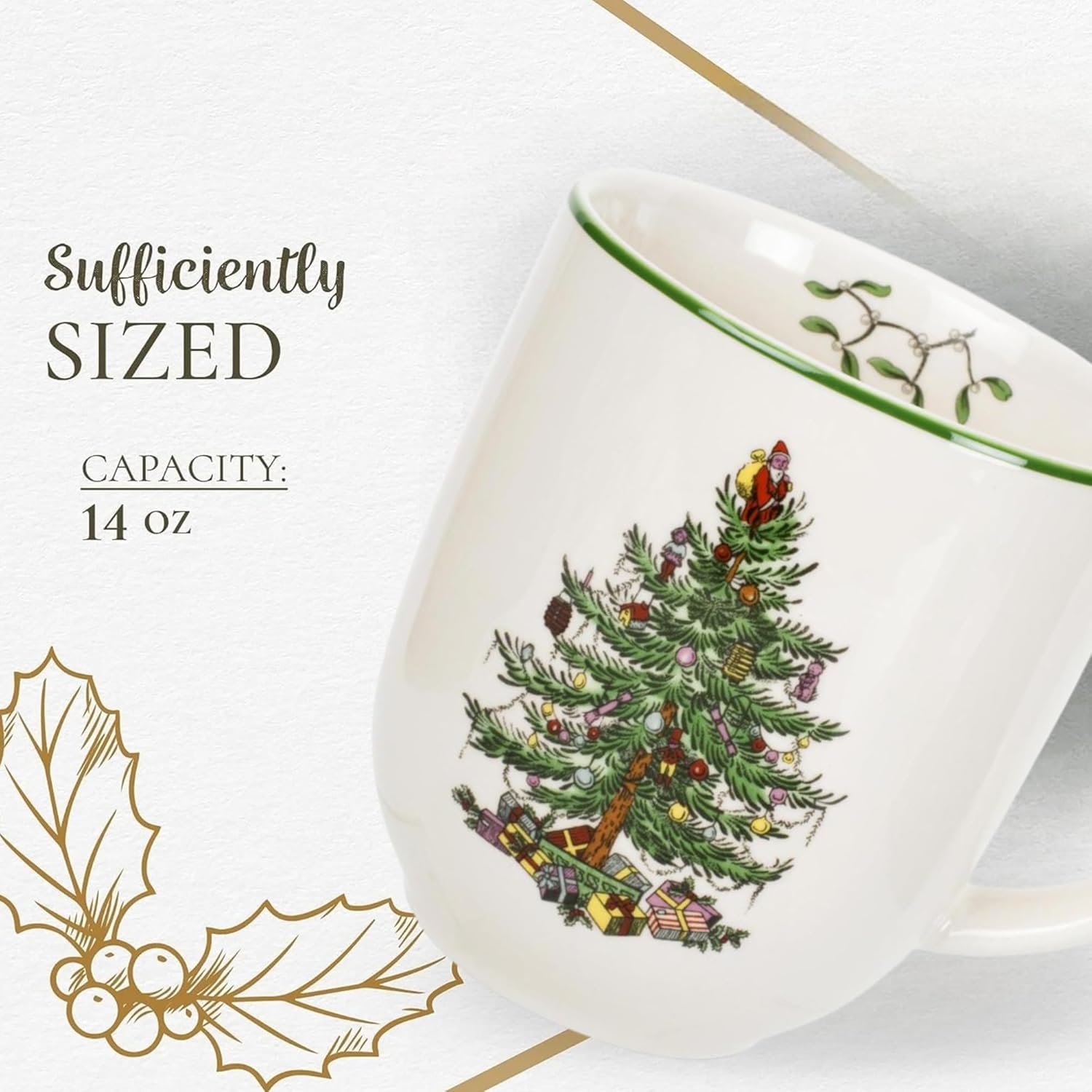 • Charming Christmas Design: Elevate your holiday celebrations with these mugs featuring a playful Santa atop a decorated Christmas tree. The cream background with green border makes each mug a festive addition to your holiday table.