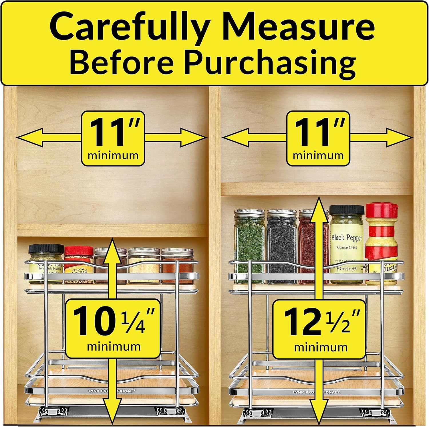 LYNK PROFESSIONAL® Élite™ Pull Out Spice Rack Organizer for Inside Kitchen Cabinets - 10-1/4 inch Wide - Slide Out Drawer – Wood/Chrome Sliding Spice Cabinet Organization Shelf Racks - 2 Tier