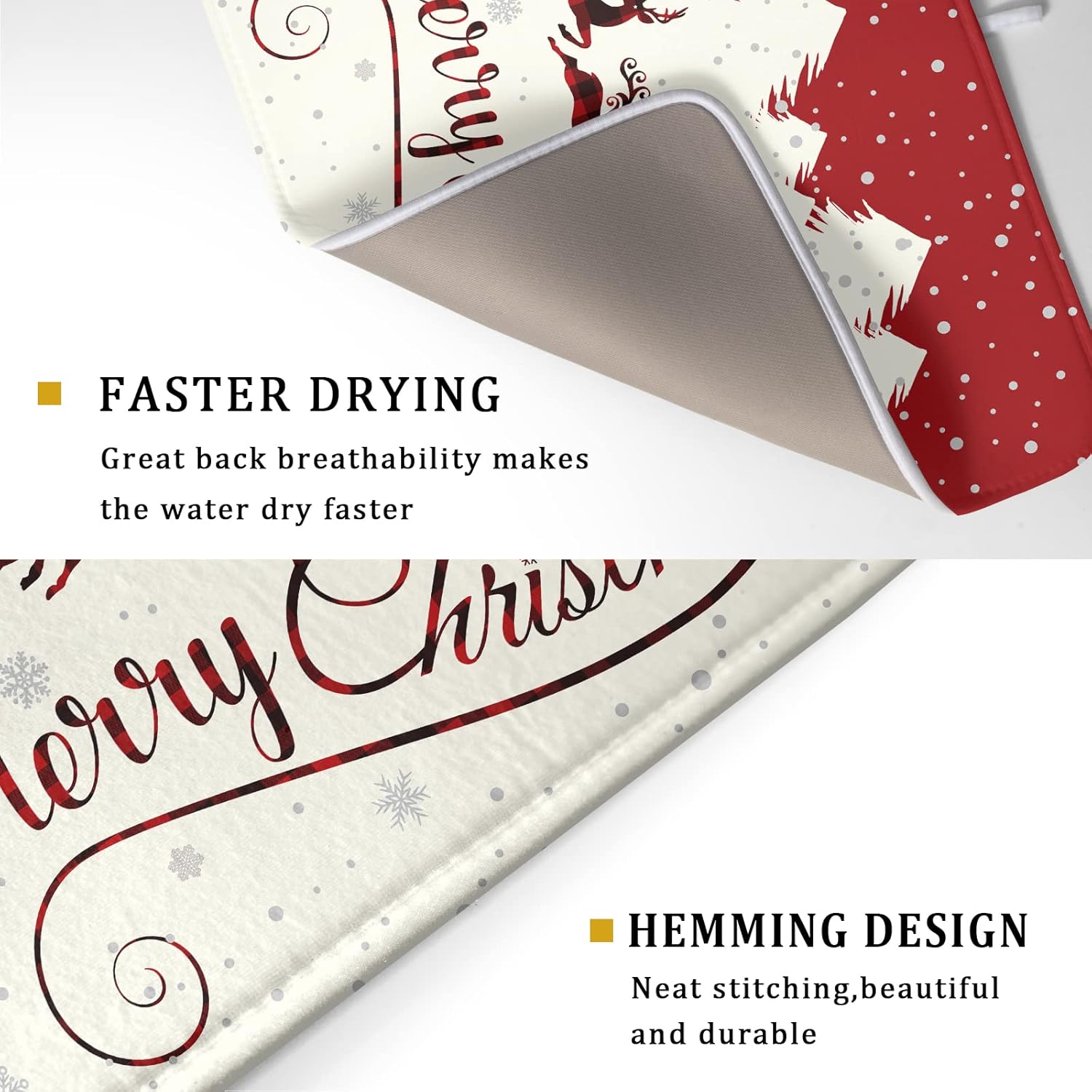 • Easy Storage: The dish drying mat with hanging loop, can be hung on the kitchen wall. This lightweight Christmas Deer kitchen dish drying mat, Soft and foldable, Microfiber is naturally, durable, and cleans up easily, and is effortless to clean. frees up space for your kitchen when in use, simply fold up and toss in a drawer or tuck it elsewhere when not in use.