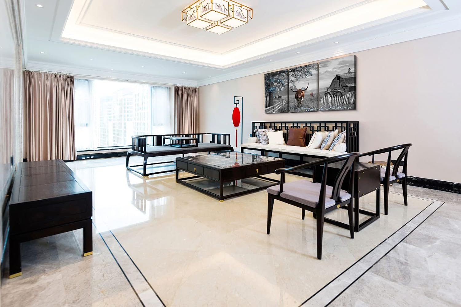 • Large Wall Art Brown Cow Size: 16X24 inches x3 piece.Rustic black and white style.Arrives ready to hang.