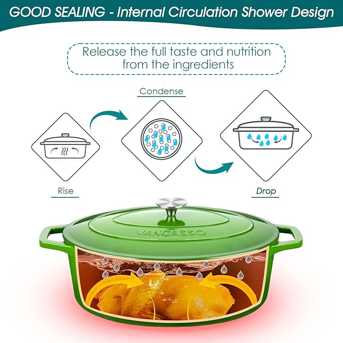 • 【One Pot For Multiple Use - Suitable For Larger Food】This 9.3-Quart vancasso enameled cast iron dutch oven is excellent for Larger food. It is resistant to acidic and alkaline substances, and you can use it to marinate food before cooking (prepare, cook, and serve food in the same pot). Safe for braising, simmering, baking, broiling, and roasting on gas, electric, ceramic, glass top, and induction stoves (not including microwave ovens); oven safe to 500°F.