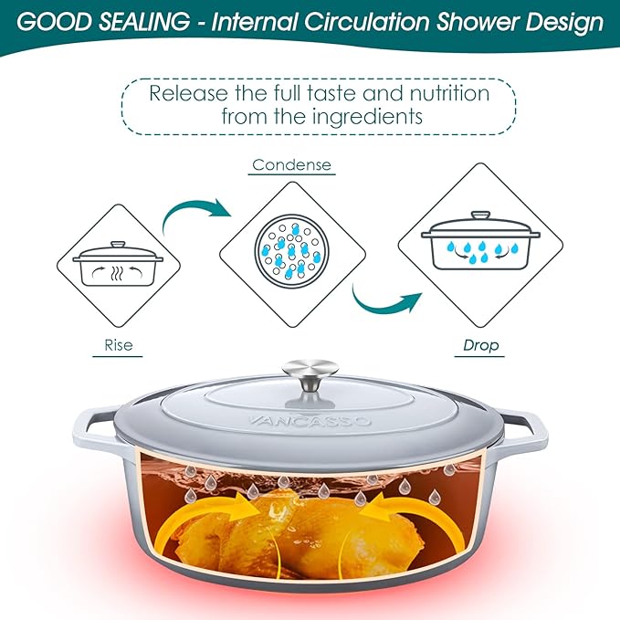 • 【One Pot For Multiple Use - Suitable For Larger Food】This 9.3-Quart vancasso enameled cast iron dutch oven is excellent for Larger food. It is resistant to acidic and alkaline substances, and you can use it to marinate food before cooking (prepare, cook, and serve food in the same pot). Safe for braising, simmering, baking, broiling, and roasting on gas, electric, ceramic, glass top, and induction stoves (not including microwave ovens); oven safe to 500°F.