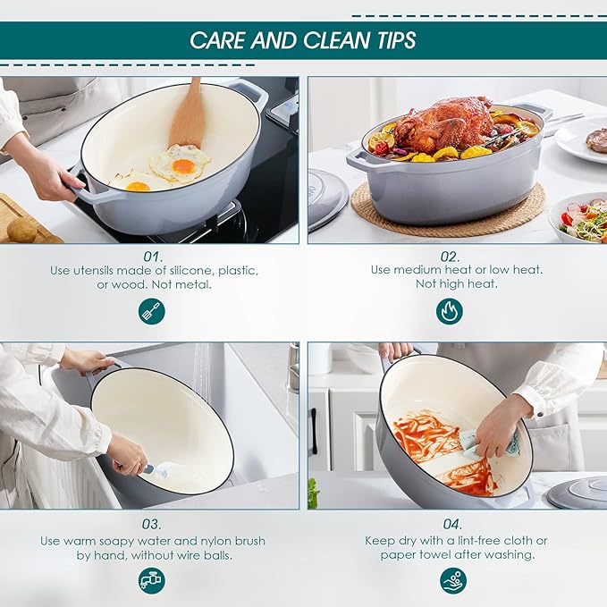 • 【French Traditional Craft】The vancasso cast iron dutch oven uses the traditional French process of pouring and forging liquid cast iron as a whole, without splicing, and not easy to break. After spraying 3 layers of enamel coating inside and outside, it is heated at 1500°F for 30 minutes. The cream-colored interior makes it easier to see the state of your food, while the classic light blue color will brighten up your kitchen.