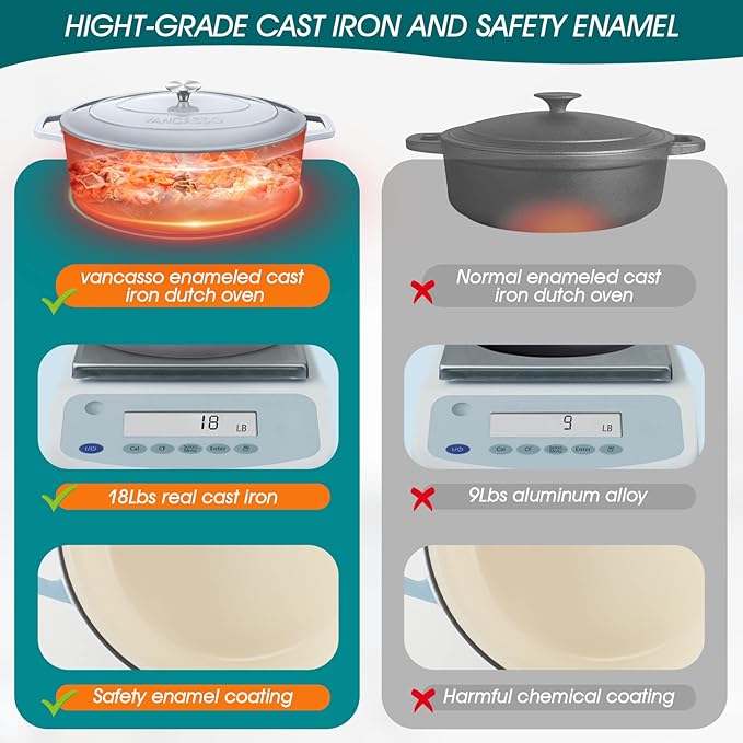 • 【18Lbs Real Cast Iron】The vancasso cast iron dutch oven pot's body is made of high-purity ore, with uniform thickness and even heat distribution. The heat retention is excellent, keeping food warm even when away from the heating source for a long time. There's no need to worry about food getting cold while waiting for family and friends to arrive. Be sure to use an oven mitt or pot holder when holding the Dutch oven; the handles can get very hot.