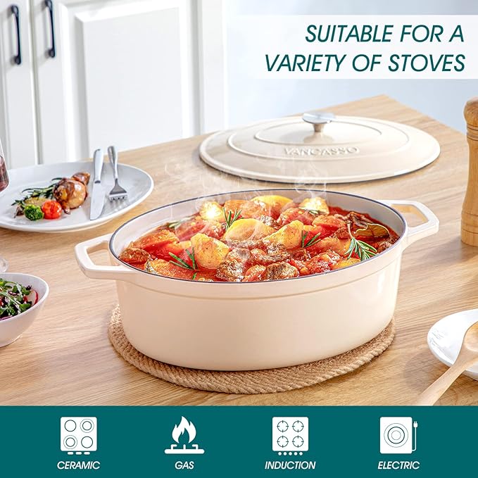 • 【One Pot For Multiple Use - Suitable For Larger Food】This 9.3-Quart vancasso enameled cast iron dutch oven is excellent for Larger food. It is resistant to acidic and alkaline substances, and you can use it to marinate food before cooking (prepare, cook, and serve food in the same pot). Safe for braising, simmering, baking, broiling, and roasting on gas, electric, ceramic, glass top, and induction stoves (not including microwave ovens); oven safe to 500°F.