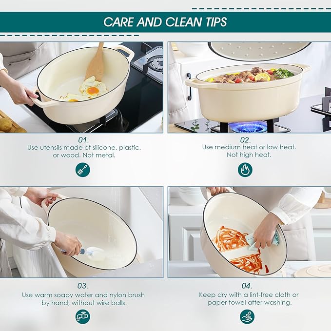 • 【Historic Enamel】Enamel was once more precious than gold, and used to fire the exclusive porcelain of the royal family. Until the French invented enameled cast iron pots in the 20th century, enamel began to reach the masses. vancasso dutch oven cast iron uses a non-stick, safe enamel coating that is cadmium, lead-free, and non-toxic even at high temperatures. Easy to clean and never fades.