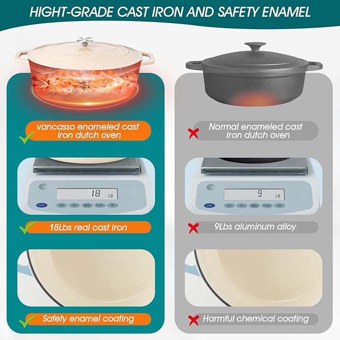 • 【18Lbs Real Cast Iron】The vancasso cast iron dutch oven pot's body is made of high-purity ore, with uniform thickness and even heat distribution. The heat retention is excellent, keeping food warm even when away from the heating source for a long time. There's no need to worry about food getting cold while waiting for family and friends to arrive. Be sure to use an oven mitt or pot holder when holding the Dutch oven; the handles can get very hot.