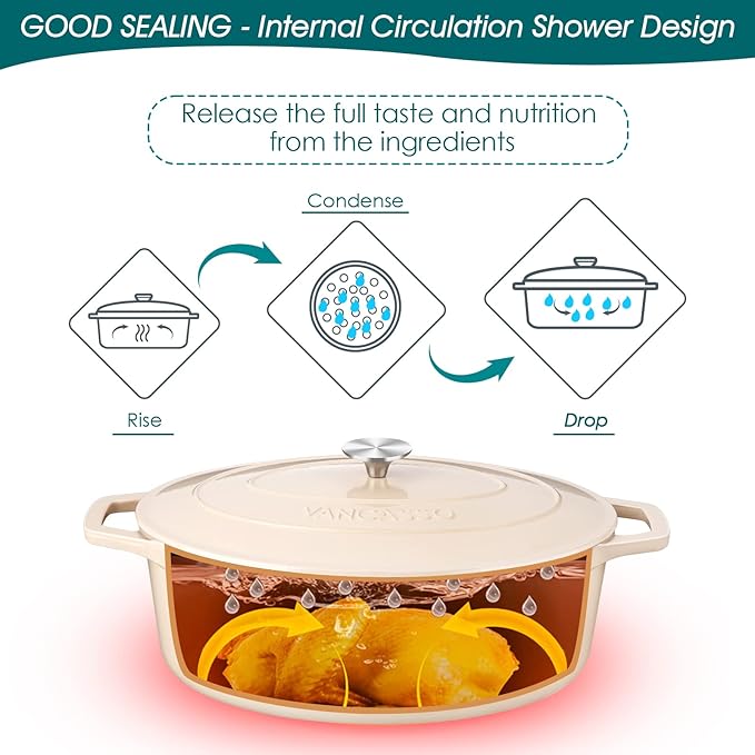 • 【Internal Circulation Shower Design】The 40 evenly distributed dots on the lid accelerate the condensation of evaporated water vapor and drip it evenly into the food. In contrast, other water vapor flows smoothly back into the cast iron pot because of the specific curvature design. The water vapor circulates and locks inside the dutch oven, fully releasing the flavor and nutrients of the ingredients.