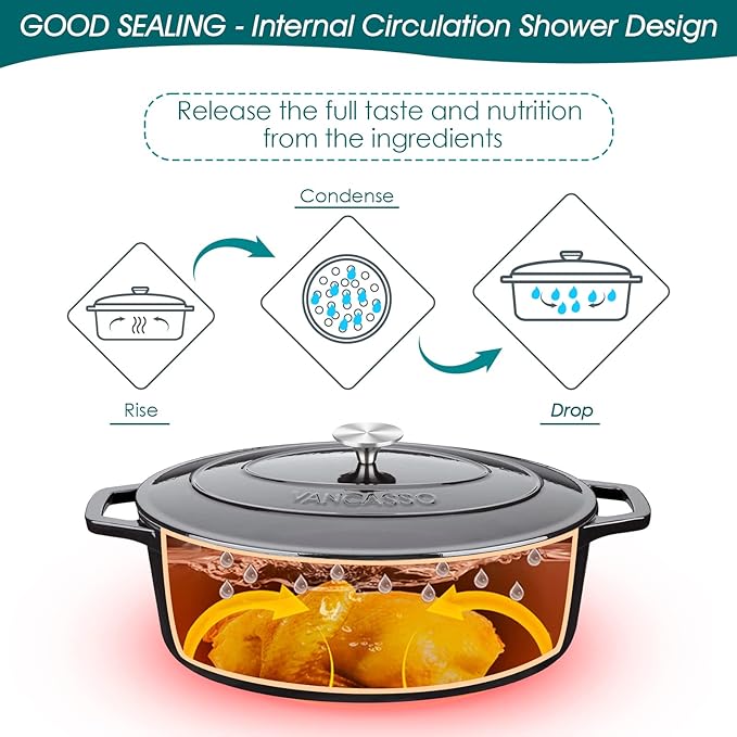 • 【Internal Circulation Shower Design】The 40 evenly distributed dots on the lid accelerate the condensation of evaporated water vapor and drip it evenly into the food. In contrast, other water vapor flows smoothly back into the cast iron pot because of the specific curvature design. The water vapor circulates and locks inside the dutch oven, fully releasing the flavor and nutrients of the ingredients.