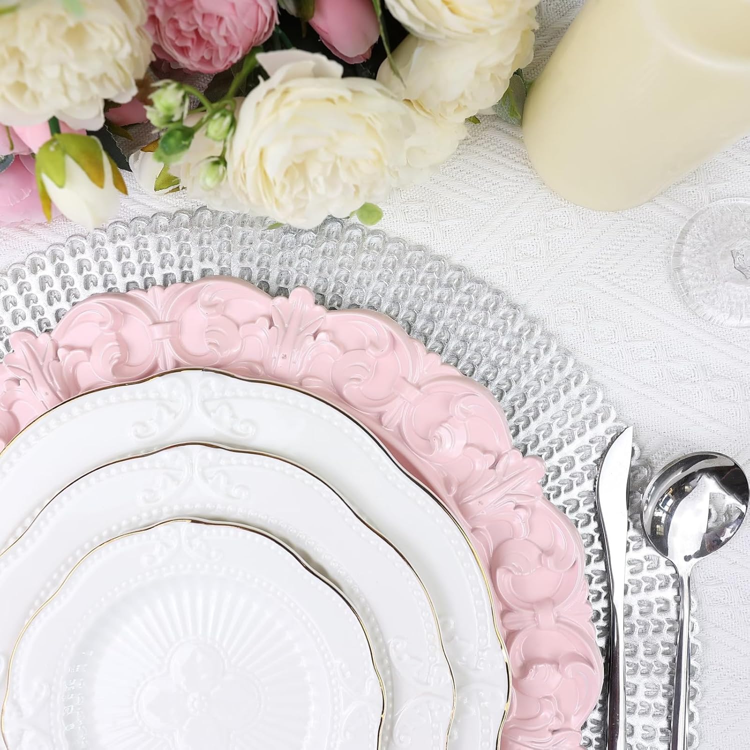 13" Pink Charger Plates, Set of 6 Plastic Textured Chargers for Dinner Plates with Embossed Rim, Table Décor, Party, Wedding, Holiday