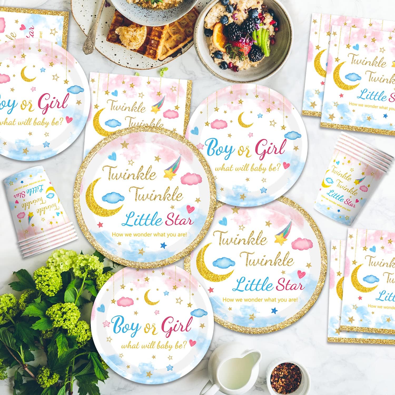 • 【Package Contents】:You'll get twinkle twinkle little star gender reveal party set that can serve 24 guests, 24 7" boy or girl dessert plates, 24 9" little star dinner plate , 24 6.5" Twinkle Twinkle Little Star paper napkins, 24 9oz gender reveal Theme Paper Cups.