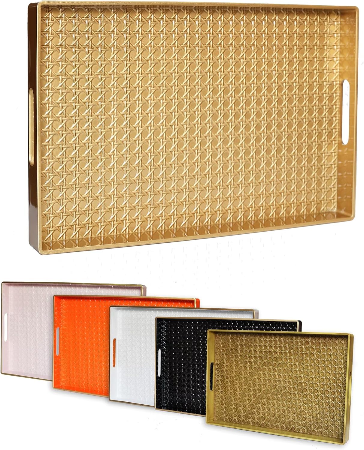 Gold Decorative Coffee Table Tray, Rectangular Plastic Serving Tray with Handles for Living Room, Ottoman, Bathroom, 15.7"*10.2"