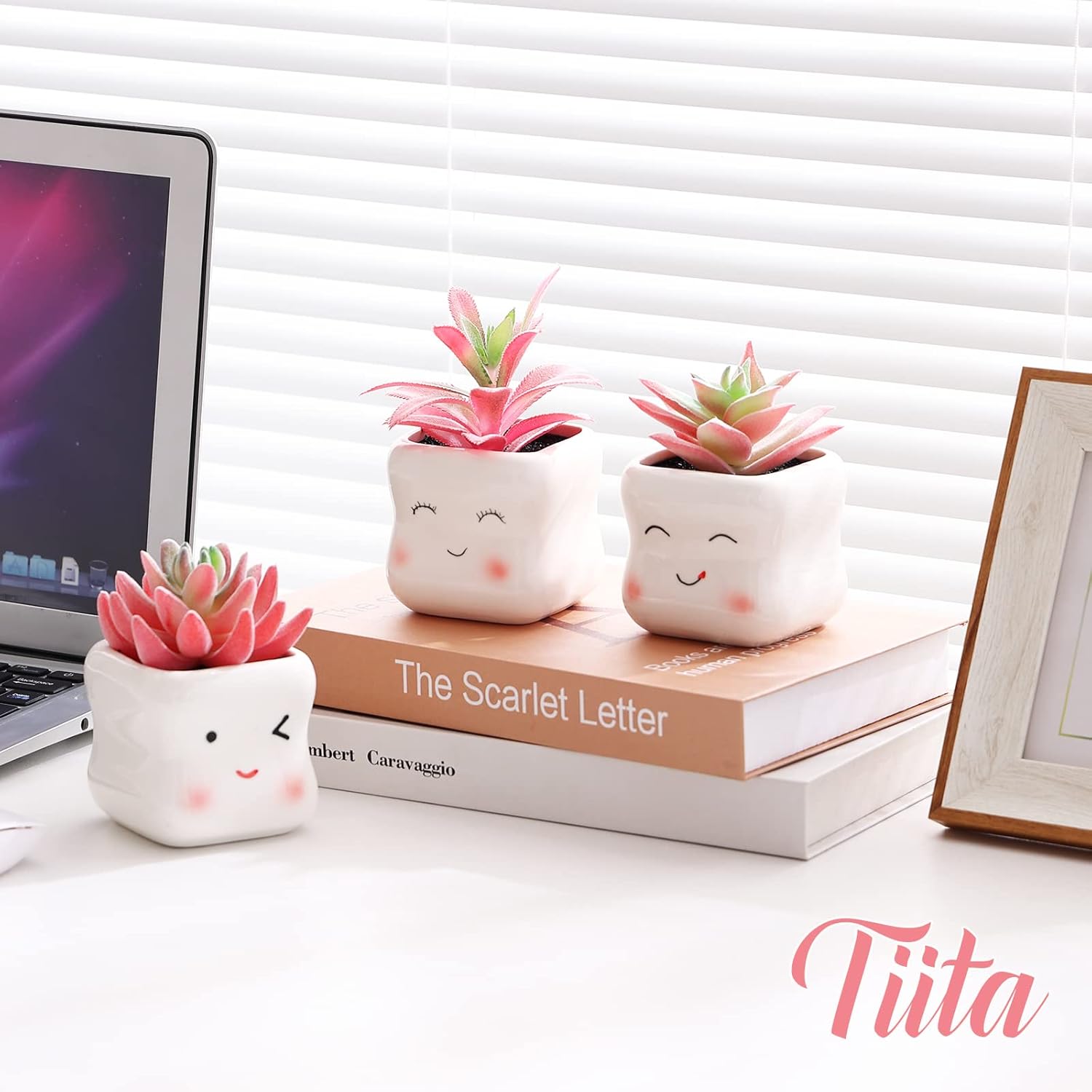 Tiita Cute Artificial Faux Succulents in Pots, Pink Fake Plants Ceramic Arrangement Planter Small Mini Tiny Decoration for Home Office Accessories Women Desk Window Sill Bathroom Bedroom