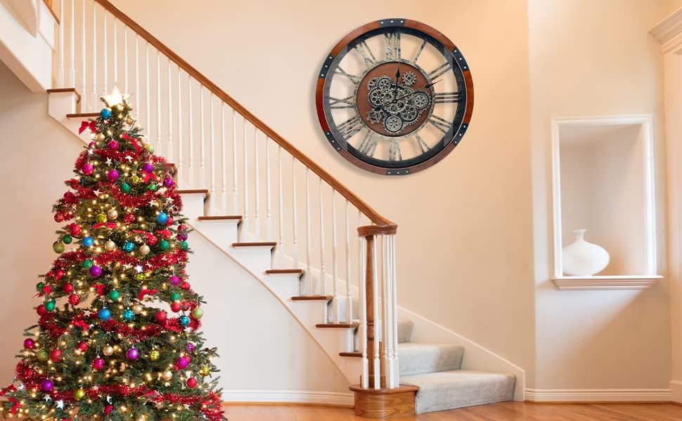 • Battery Operated, Easy to Use: The Large industrial wall clock arrives fully assembled, Powered by 3 x AA battery ( not included ): 2 batteries for the gears to start spinning,1 battery for the clock hands to move to tell the time; Gears move independently of hands. With a hanging hole on its back and including the hanger for easy to installation