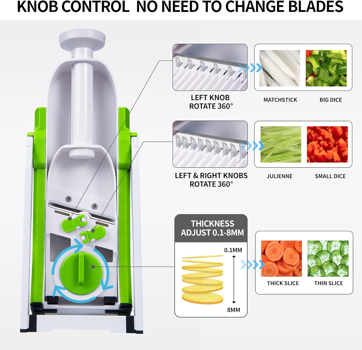 • MUTIPLE CUTTING TYPES: This vegetables Chopper with 4 cutting types: slicing, julienne, matchstick, and dicing, adjust potatos thickness range from 0.1 to 8mm, the port size is 2.9in suited for potatoes, garlic, onion, carrots..., perfect kitchen chopping artifact.Cut Your Vegetable Like a Pro with our mandoline food slicer! Notes: please don't cut meat.