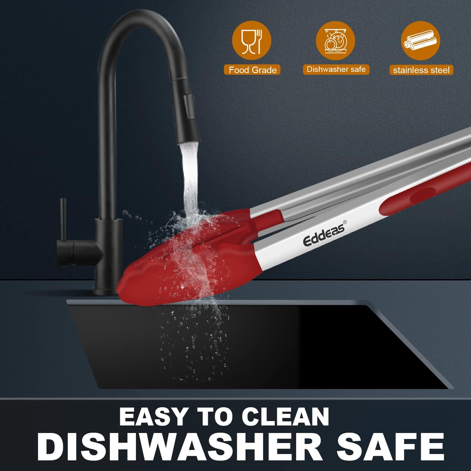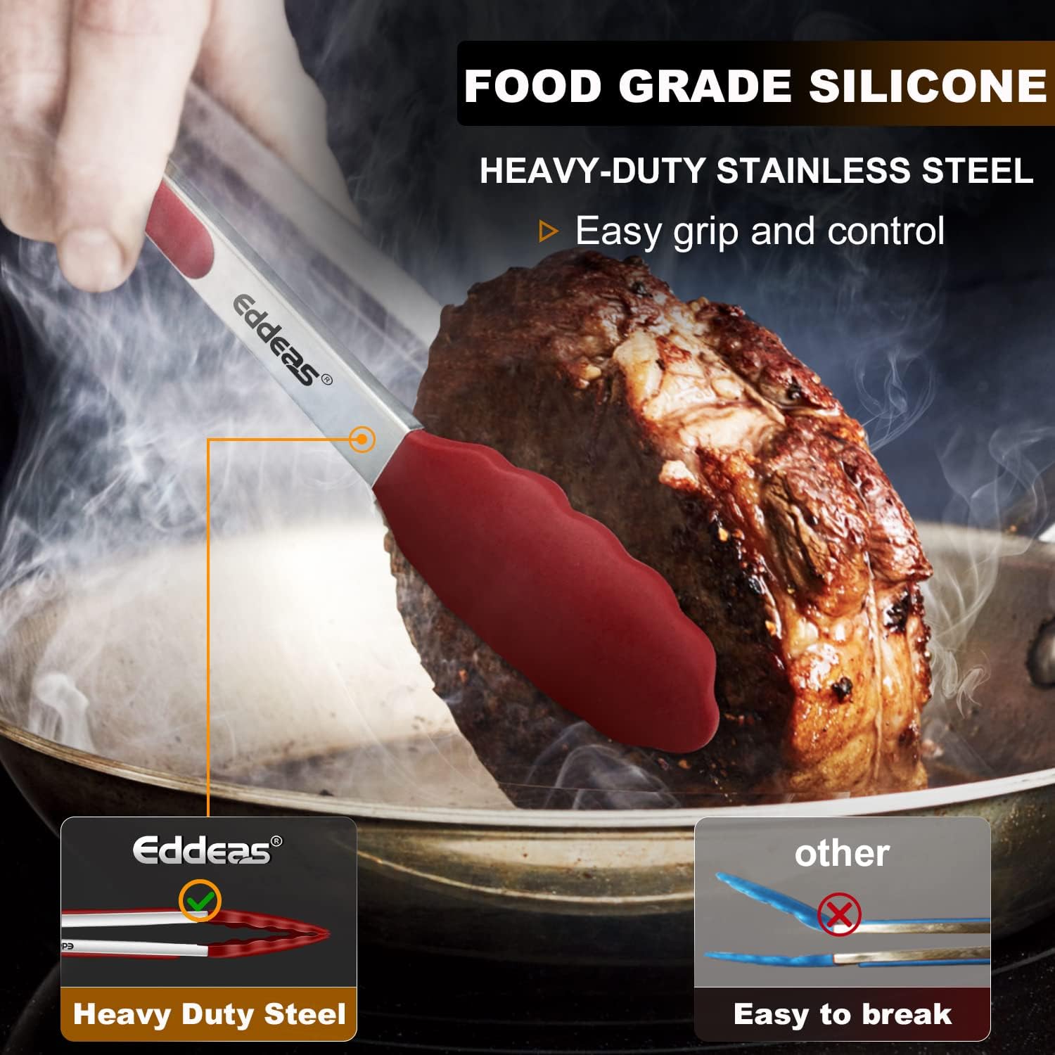 • EDDEAS NON STICK SILICONE TIP, Silicone KitchenTongs for Cooking won't MELT, RUST OR FLAKE-The tip is made of food-grade silicone, which is safety-tested, heat resistant up to 480°F . Food tongs with non-stick silicone tips protect your cookware from damage, easy to clean and dishwasher safe.