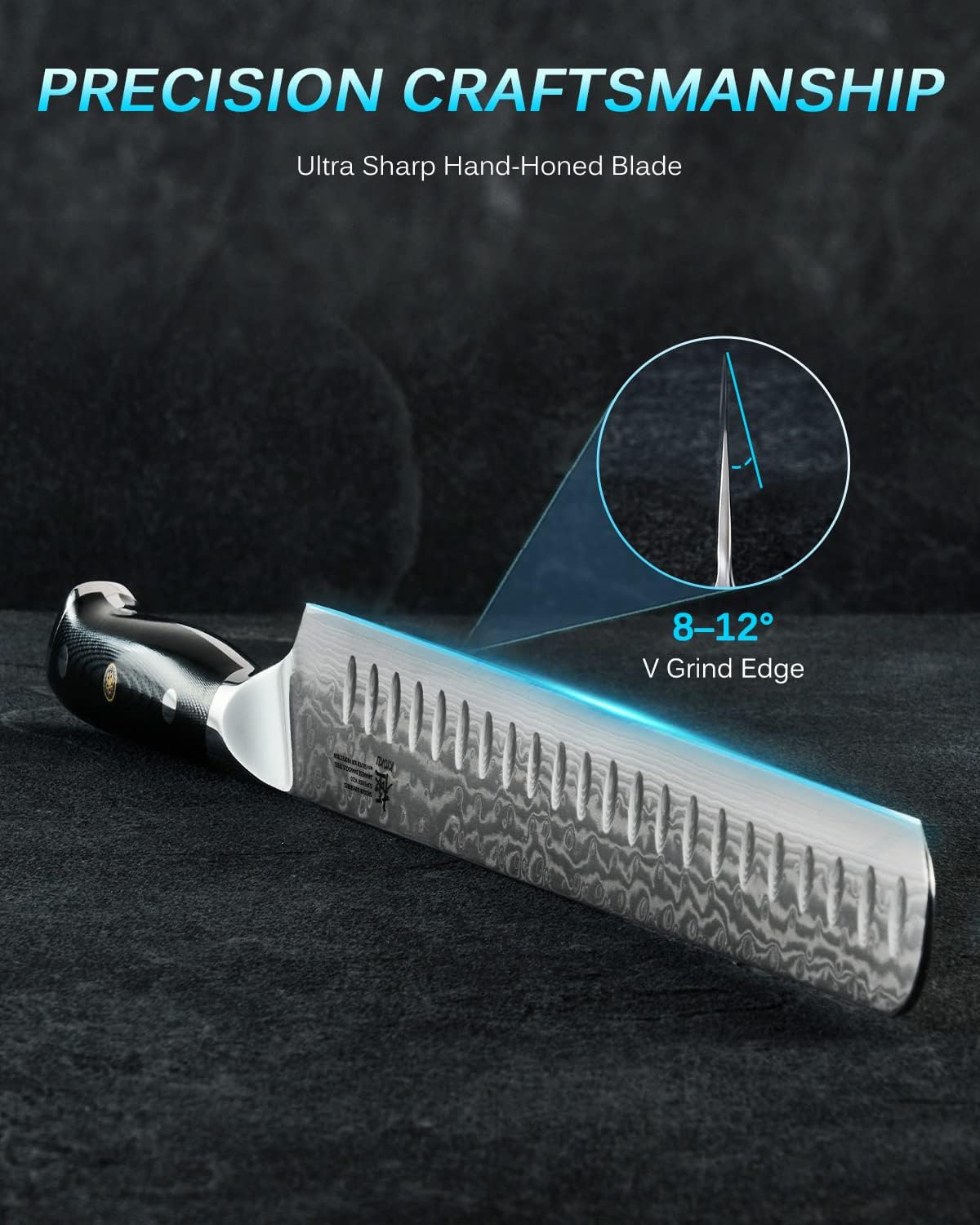 • ULTRA-SHARP BLADE: Sharpened to 8 to 12 degrees on each side using the traditional 3-step Honbazuke method, this carving knife's long blade and indentation are perfect for cutting even and thin slices through large cuts of meat, fruit, and vegetables