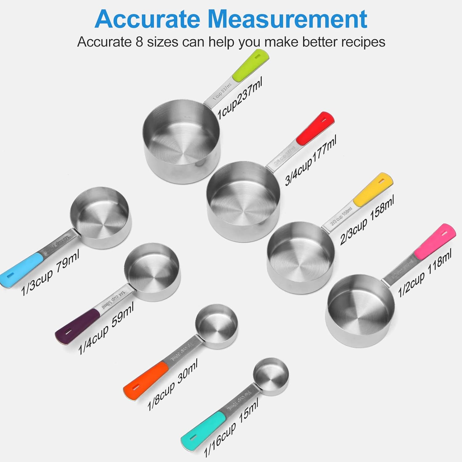 • Cup measuring set includes 8 measuring cups 1/16, 1/8, 1/4, 1/3, 1/2, 2/3, 3/4,1.