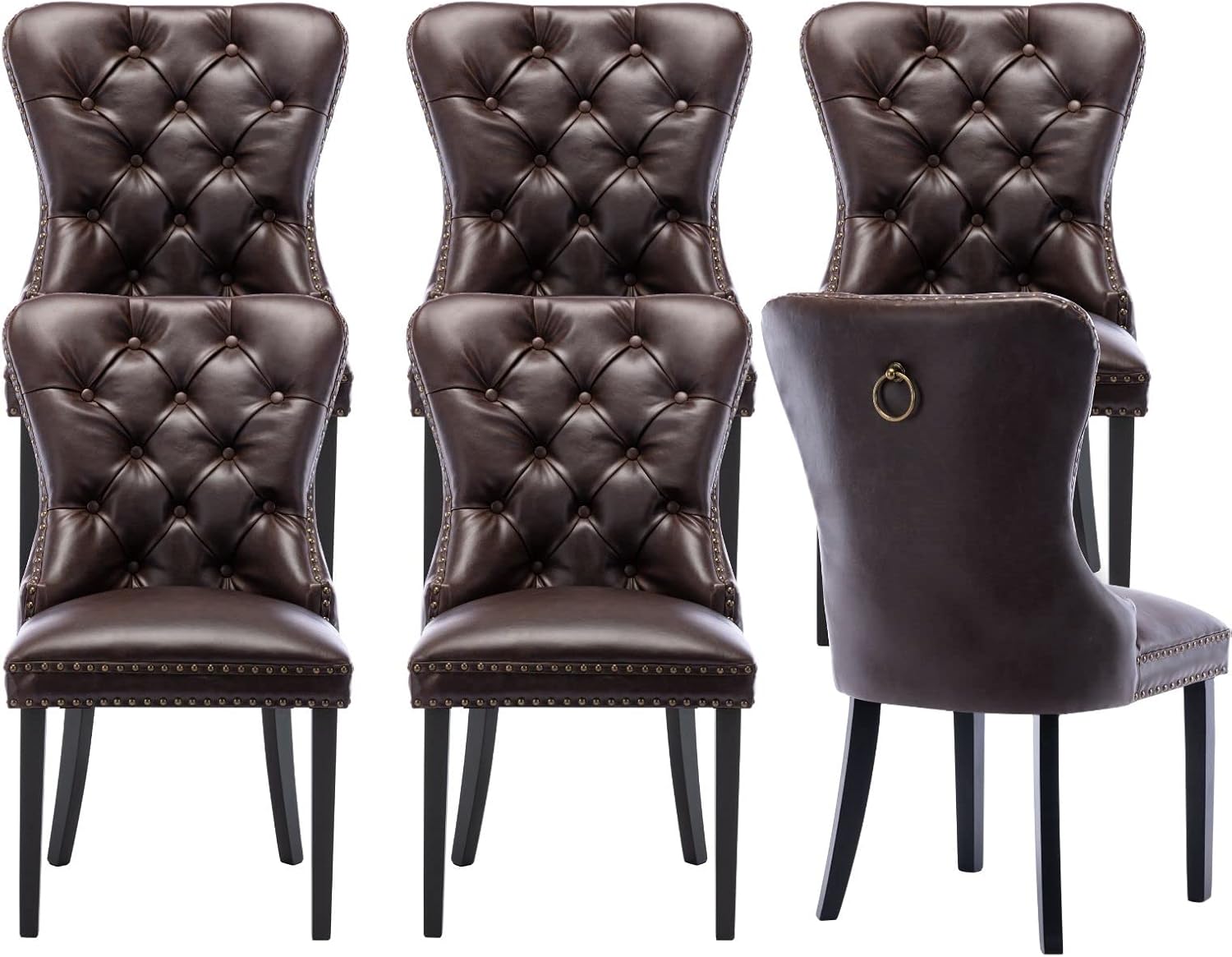 PU Leather Dining Chairs Set of 6 Mid Century Modern Tufted Chairs Armless Rubber Wood Vintage Chairs Upholstered Nailhead Side Chair for Kitchen/Cafe Decor Furniture, Coffee with Pull Ring