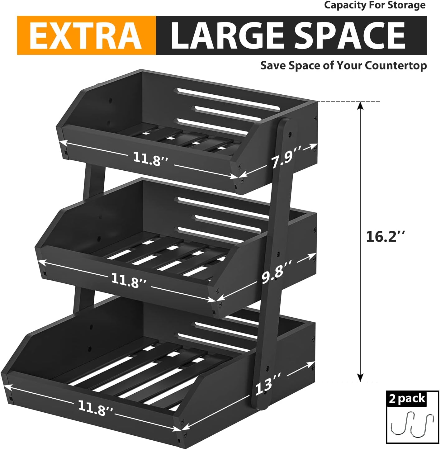 Bamboo Fruit Basket for Kitchen – 3 Tier Fruit Bowl For Kitchen Counter, Large Fruit Holder With 2 Banana Hangers, Idea For Fruit and Vegetable Storage, Bread Basket, Snack Organizer(BLACK)