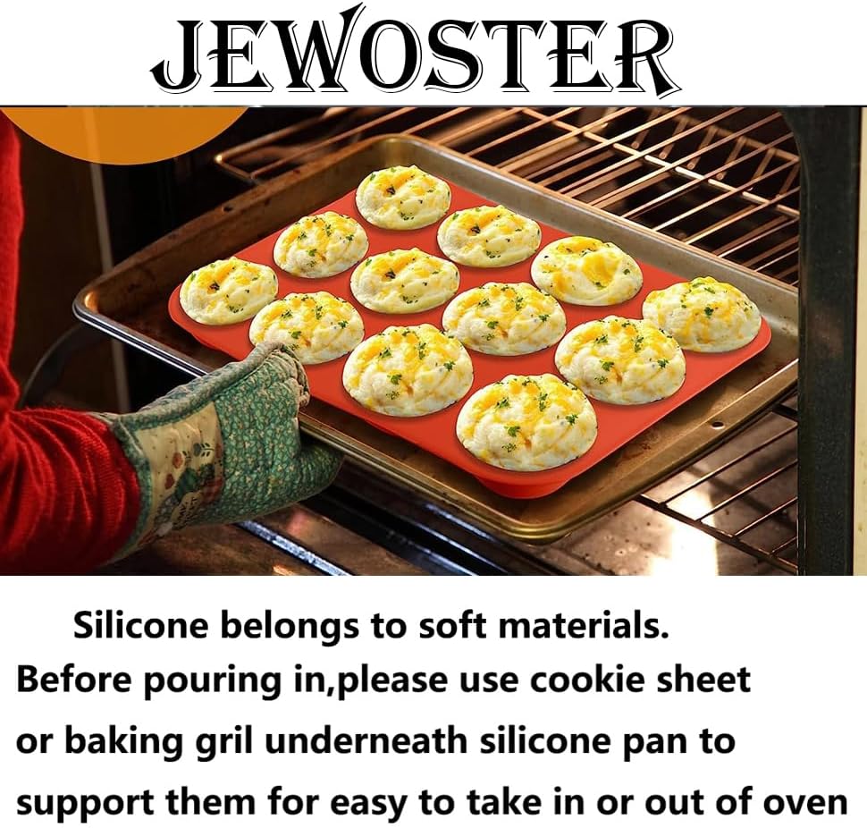 • FOOD GRADE SILICONE - (Silicone material is relatively soft.Before pouring in,please use cookie sheet or baking gril underneath silicone pan to support them for easy to take in or out of oven.For better demoulding result, it is recommended to spray a little layer of butter first)The muffin pans nonstick 24 is made of food-grade silica gel. Unlike aluminum pans, Jewoster muffin pans do not require coating to stay non-sticky,we ensure you have a non-stick experience.The reusable muffin tray is durable.