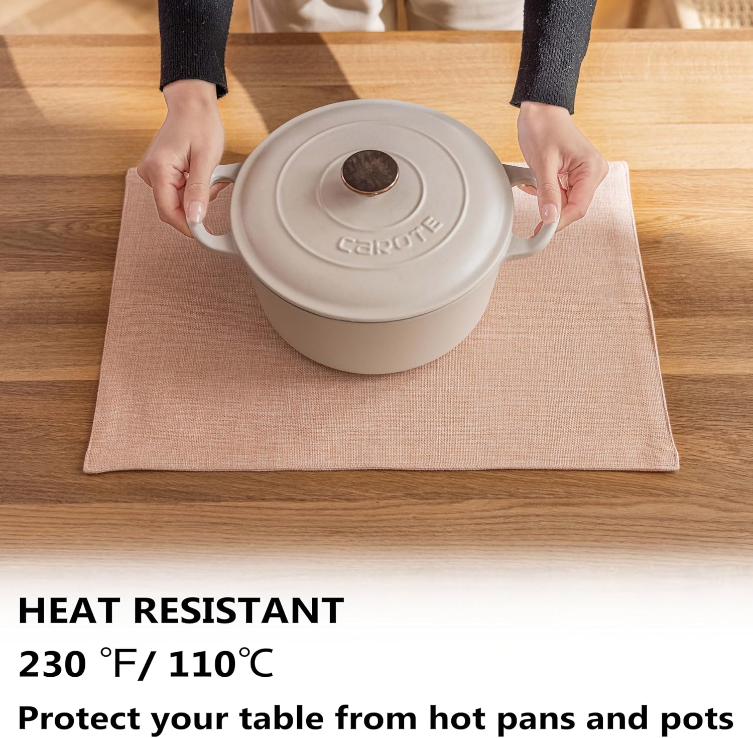 • Premium Fabrics: Our place mats are made of faux linen fabric, eco-friendly and durable placemats with exquisite workmanship which can be used for a long time. Not waterproof and liquid can go through placemats