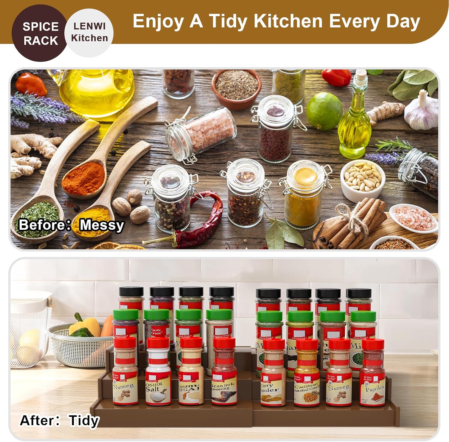 • 【Extendable Design】The spice rack organizer is retractable and has a width range of 8.74" - 15.59". The width can be adjusted according to your needs, making efficient use of your storage space. Wonderful storage solution for spice jars