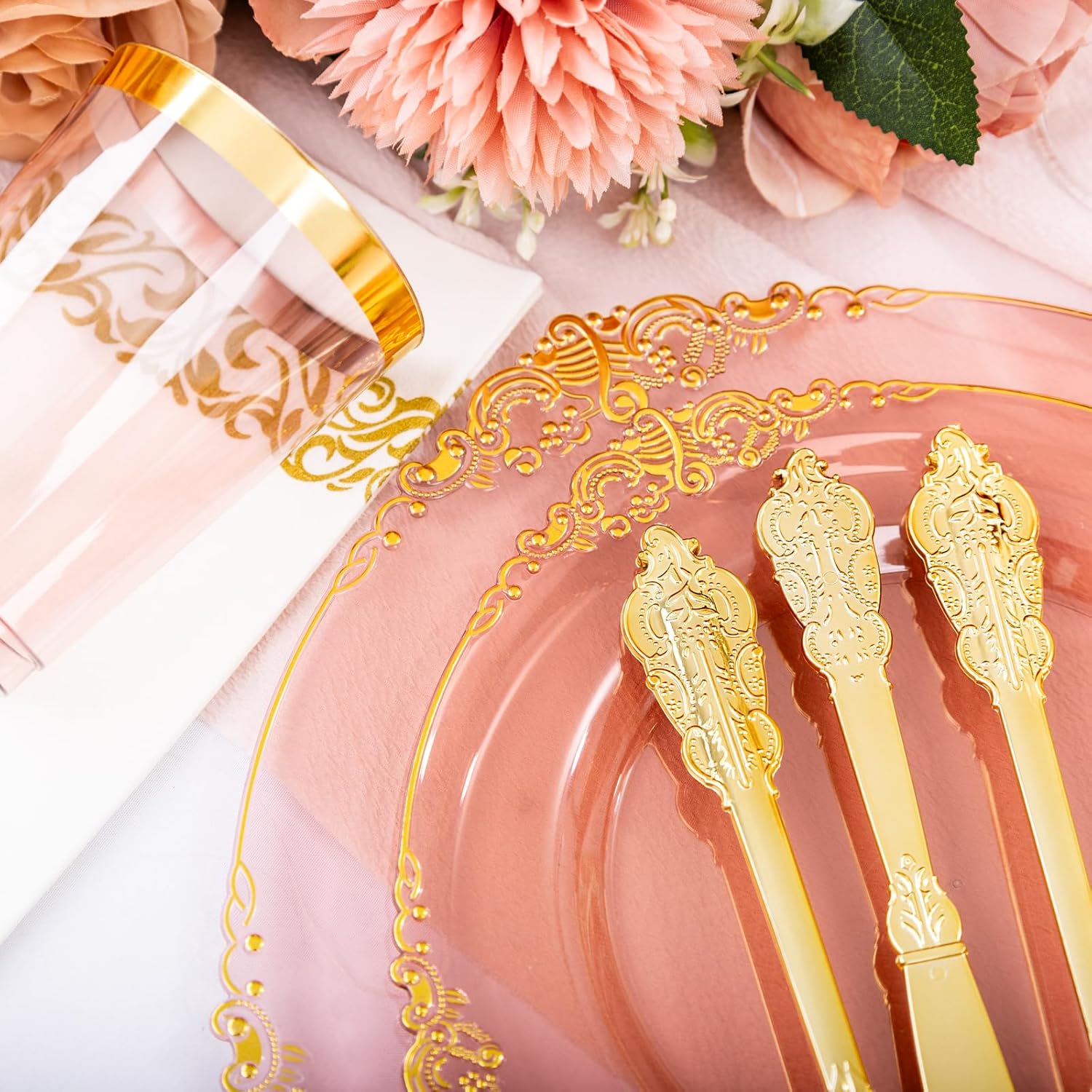 • Best Components - 175 piece burgundy plastic plates with gold trim includes 25dinner plates,25dessert plates,25Knives,25Forks,25Spoons,25Cups,25Napkins so there are plenty for your to serve you family or guests multiple courses.