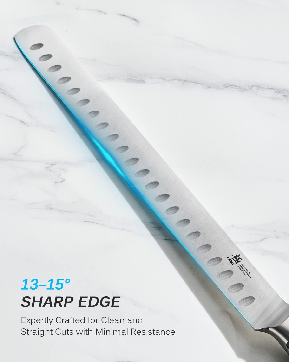 • Razor Sharp Blade: This meat carving knife's ultra-sharp blade is precisely honed to 13-15 degrees, making it perfect for slicing hams, ribs, roast beefs, briskets, and prosciutto, while the dimples prevent food from sticking.