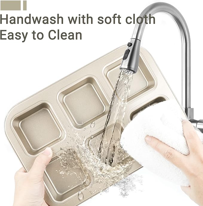 • Sturdy Durable Pan for Edge Lovers --- Beasea muffin sheet tray with 6 dividers can work perfectly to get the corner brownies with crusty edges. It’s also used for muffins, can do a beautiful job of cooking then with the crispy edge and soft center. With the carbon steel material, the mini loaf bread baking sheet is sturdy and durable to be baked evenly in oven. It can help make a nice change from round, gets a cute shape of tea biscuits, muffins and batter breads made in this sturdy pan.