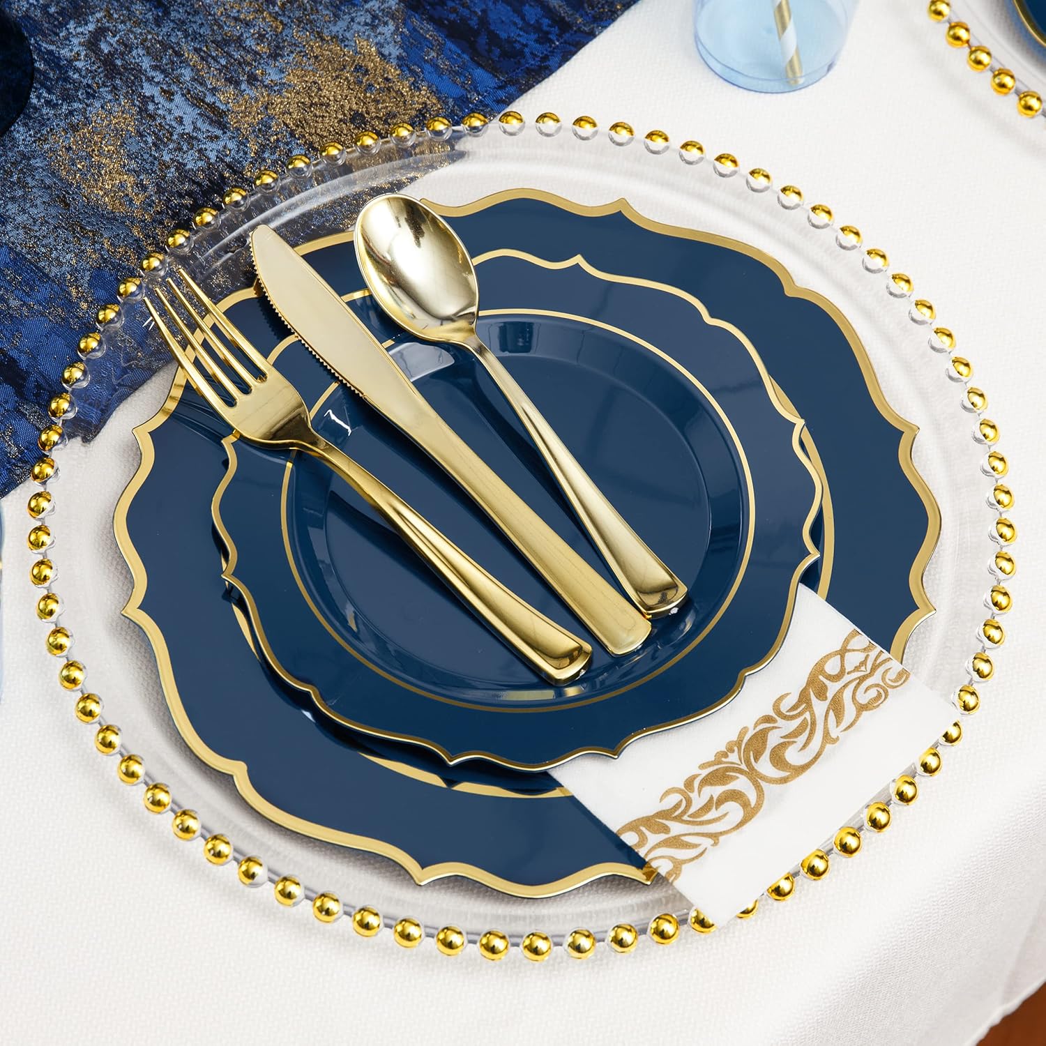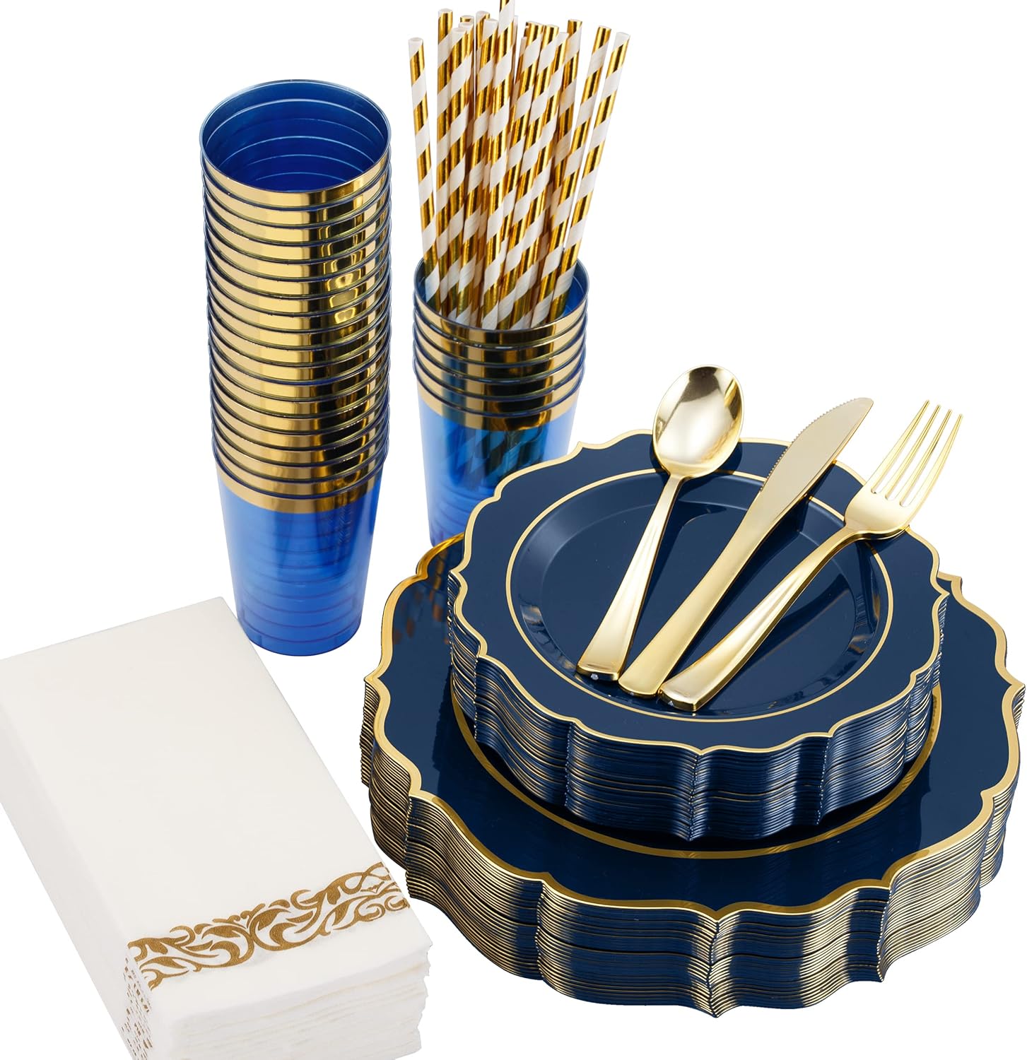 200 PCS Premium Blue Plastic Plates for 25 Guests, Heavy Duty Blue and Gold Disposable Plate, include 25 Plastic Dinner/Dessert Plates, 25 Silverware Set, 25 Cups, Straws for Party Graduation