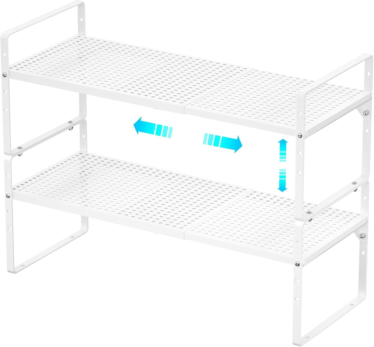Redrubbit Expandable Cabinet Storage Shelf, Adjustable Height Steel Metal Kitchen Counter Organizers Shelves Spice Rack for Kitchen Pantry Bathroom Cupboard Desk Home Office, White-2 Pack