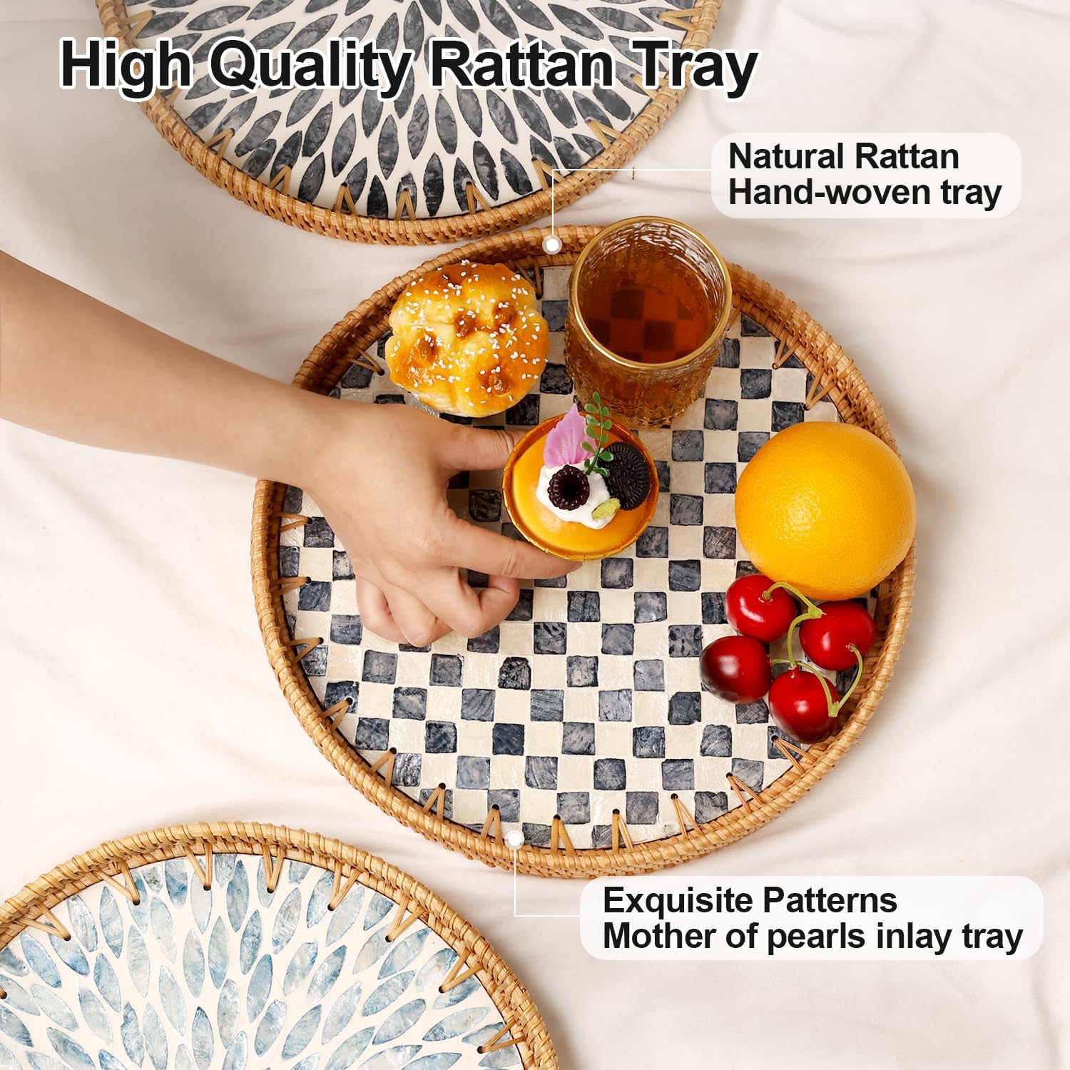 Round Rattan Tray with Mother of Pearl Inlay, Rattan Serving Tray for Coffee, Bread, Fruits, Decorative Wicker Tray for Table Decor, Home Decor, Kitchen Island Decor(Black Checkerboard, 11.8")