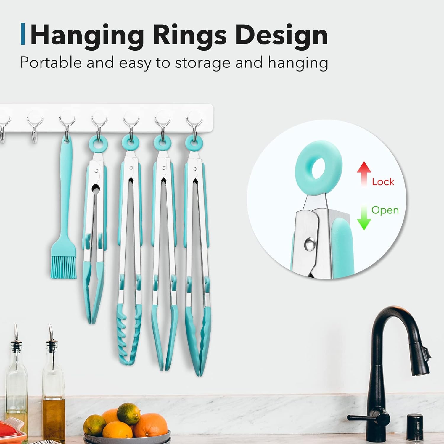 • SILICONE KITCHEN SET: Our sky blue tongs set includes 1pc 13.5" Food Tong,1pc 13" Spatula Tong,1pc 13" Pasta Tong,1pc 10.7" Steak Tong and 1pc 8.1" Silicone Brush.Designed in blue color and stainless steel tones,this silicon tongs kitchen utensils set has an super fashionable look,practical function that is madly in line with the current styles and daily needs.Comes in a exquisite box,it is sure to delight your friends and family!
