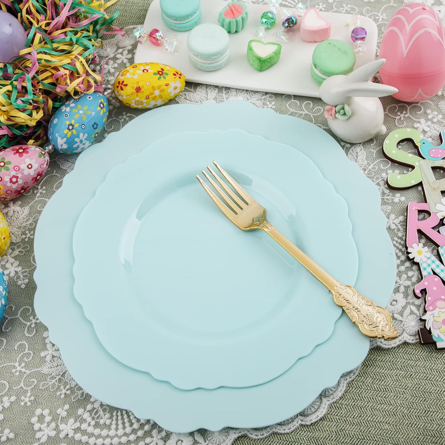 WDF 60pcs Mint Green Plastic Plates - Baroque Dinner Plates Including 30 Green Plates Disposable10.25inch, 30 Dessert Plates 7.5inch for Upscale Wedding, Parties