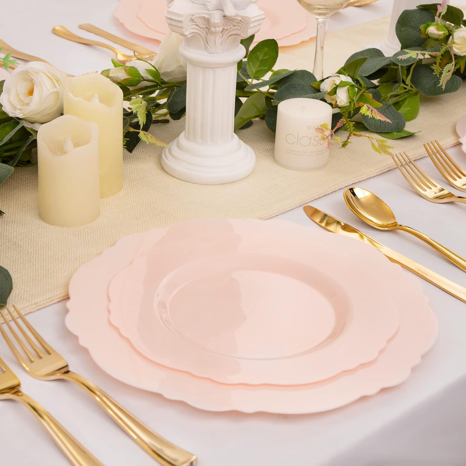 WDF 60pcs Pink Plastic Plates - Baroque Pink Disposable Plates Including 30 Dinner Plates 10.25inch, 30 Dessert Plates 7.5inch for Upscale Wedding &Parties