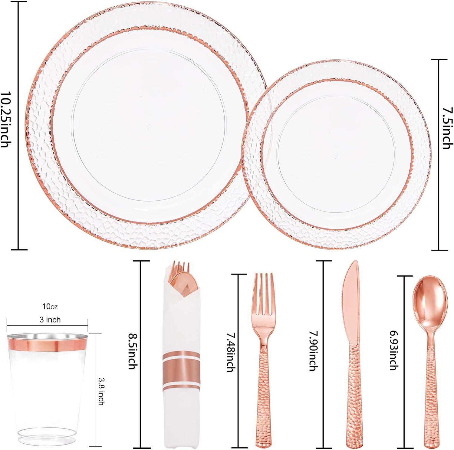 • EXQUISITE DESIGN - These rose gold plastic plates and disposable rose gold silverware contain special designs with diamonds that look gorgeous and can add color to your party with our disposable plastic plates.