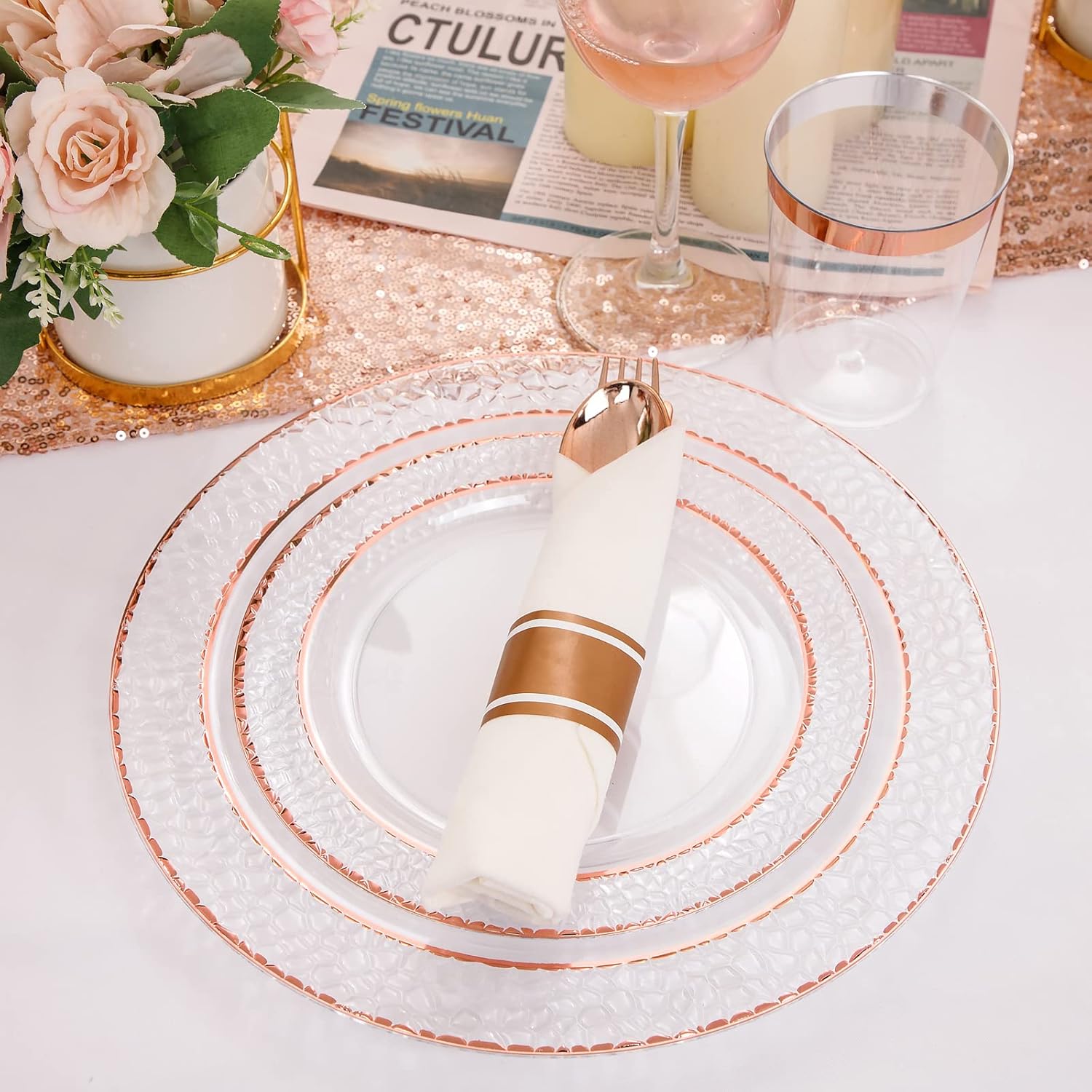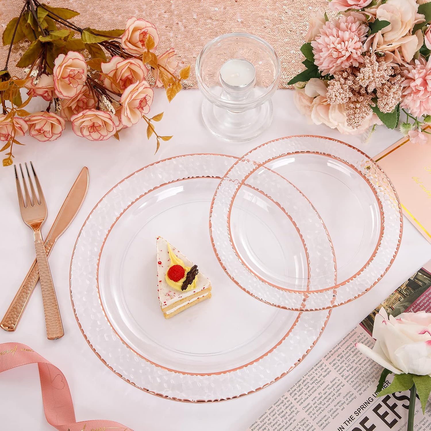 Liacere 350PCS Rose Gold Plastic Plates-Clear Rose Disposable Plates 50 Guests include 50 Dinner Plates,50 Salad Plates,50 Forks,50 Knives,50 Spoons,50 Cups,50 Napkins for Wedding&Party&Mother's Day