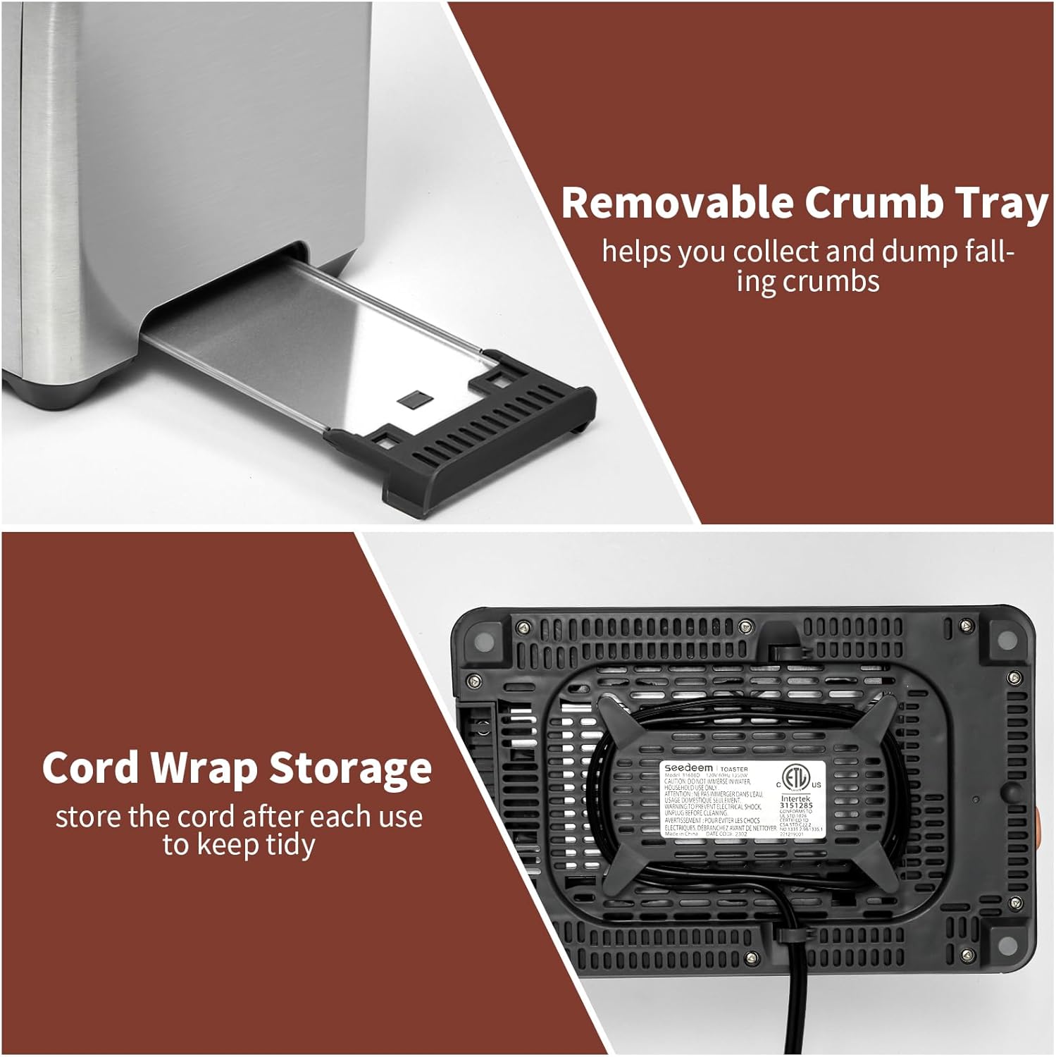 • Easy Operation & Cleaning: 1.4in extra wide slots can accommodate different types and thicknesses of bread. Cord storage at the bottom helps you clean up messy wires. Removable crumb tray helps you collect and dump falling crumbs. Memory function will keep the bread type and shade settings from the last toasting