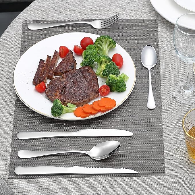 • 20 PCS SILVERWARE SET FOR 4: Includes 4 steak knives, 4 dinner knives, 4 dinner forks, 4 dinner spoons and 4 teaspoons, it is an essential silverware set for daily family meals, and is also perfect for restaurants, hotels, travel, camping, etc