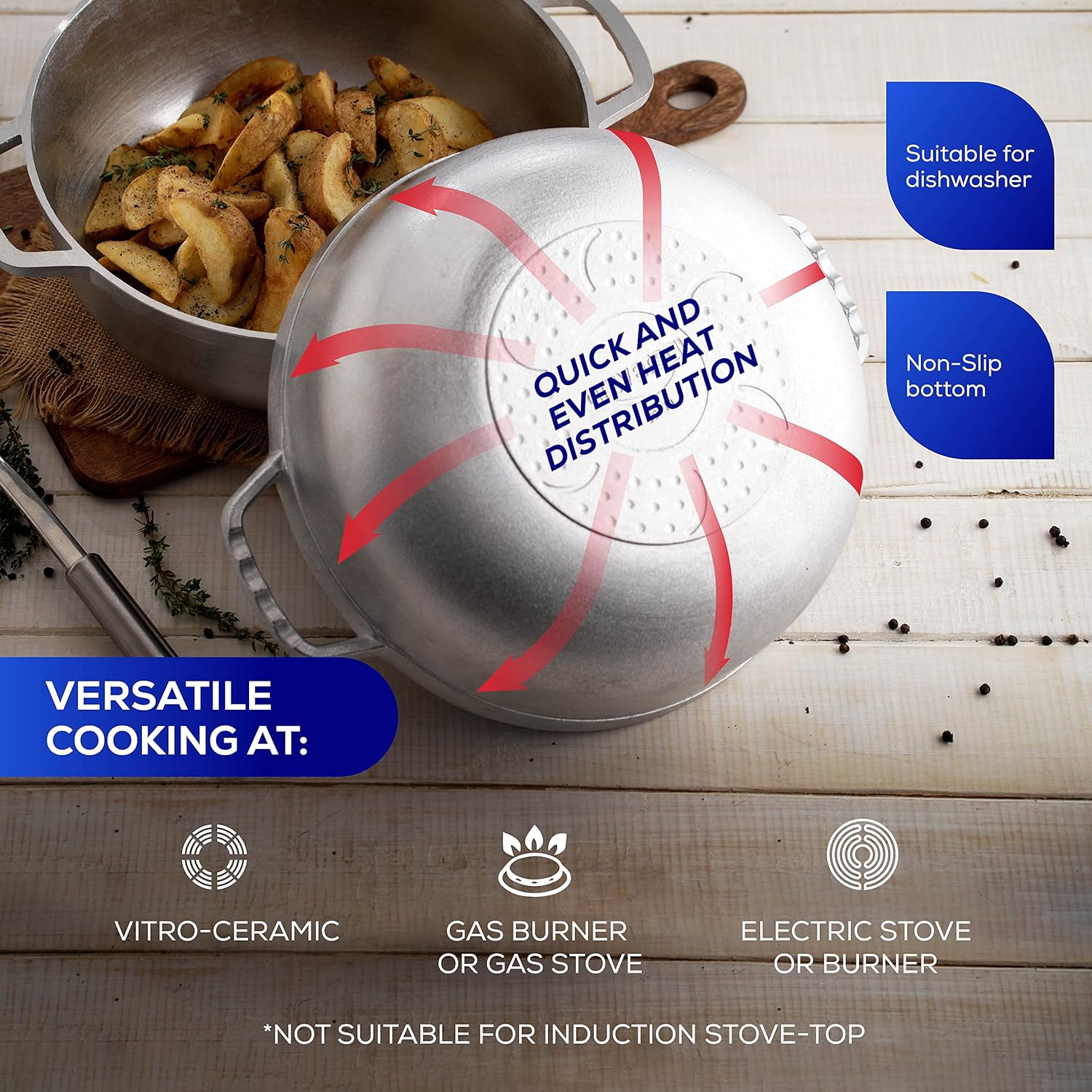 • ✅ Durable & Efficient Cast Aluminum Caldero – Perfect for Everyday Cooking: Designed for home kitchens, this lightweight yet ultra-resistant 6.3 QT caldero ensures even, rapid heating, allowing you to prepare meals faster and more efficiently. The premium stainless cast aluminum construction helps retain flavors, ensuring that every dish is cooked to perfection. Plus, it’s easy to clean and won’t absorb odors or alter the taste of your food.