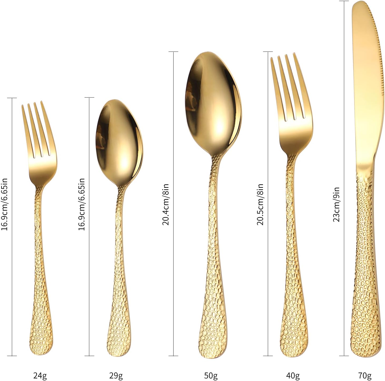 • Style : Round Wide Hammered Handle Gold Silverware