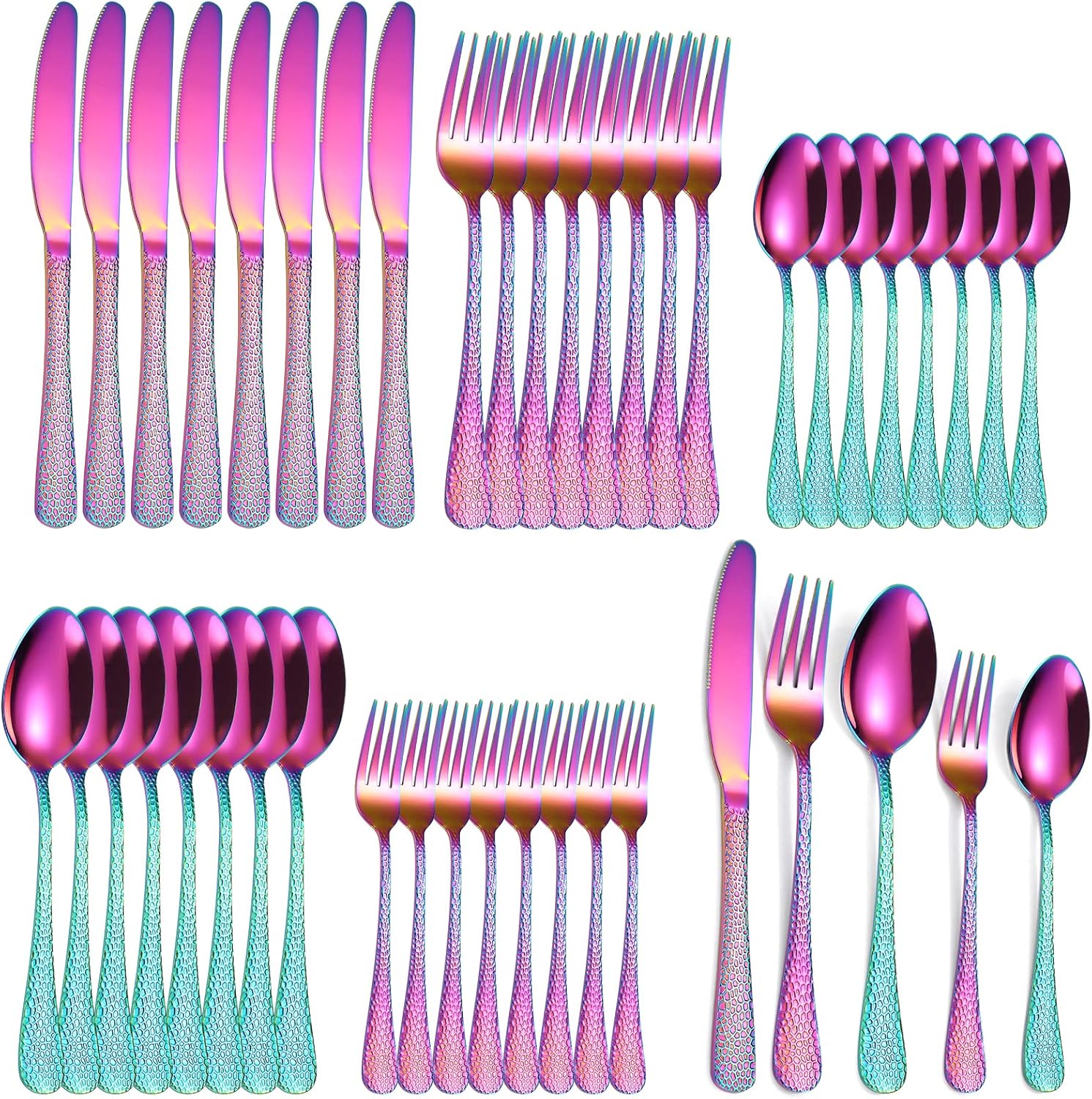 Hammered Silverware Set Rainbow Stainless Steel Flatware 40 pieces Dinning Utensils Service for 8 include Knife Fork Spoon Durable Easy to Clean