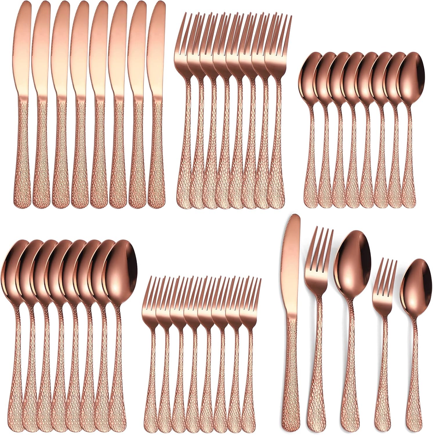 • ELEGANT AND LUXURIOUS: This 40 piece copper flatware set adds a touch of elegance and luxury to any dining experience. Crafted with beautiful hammered detailing, this set is designed specifically for special occasions or everyday use
