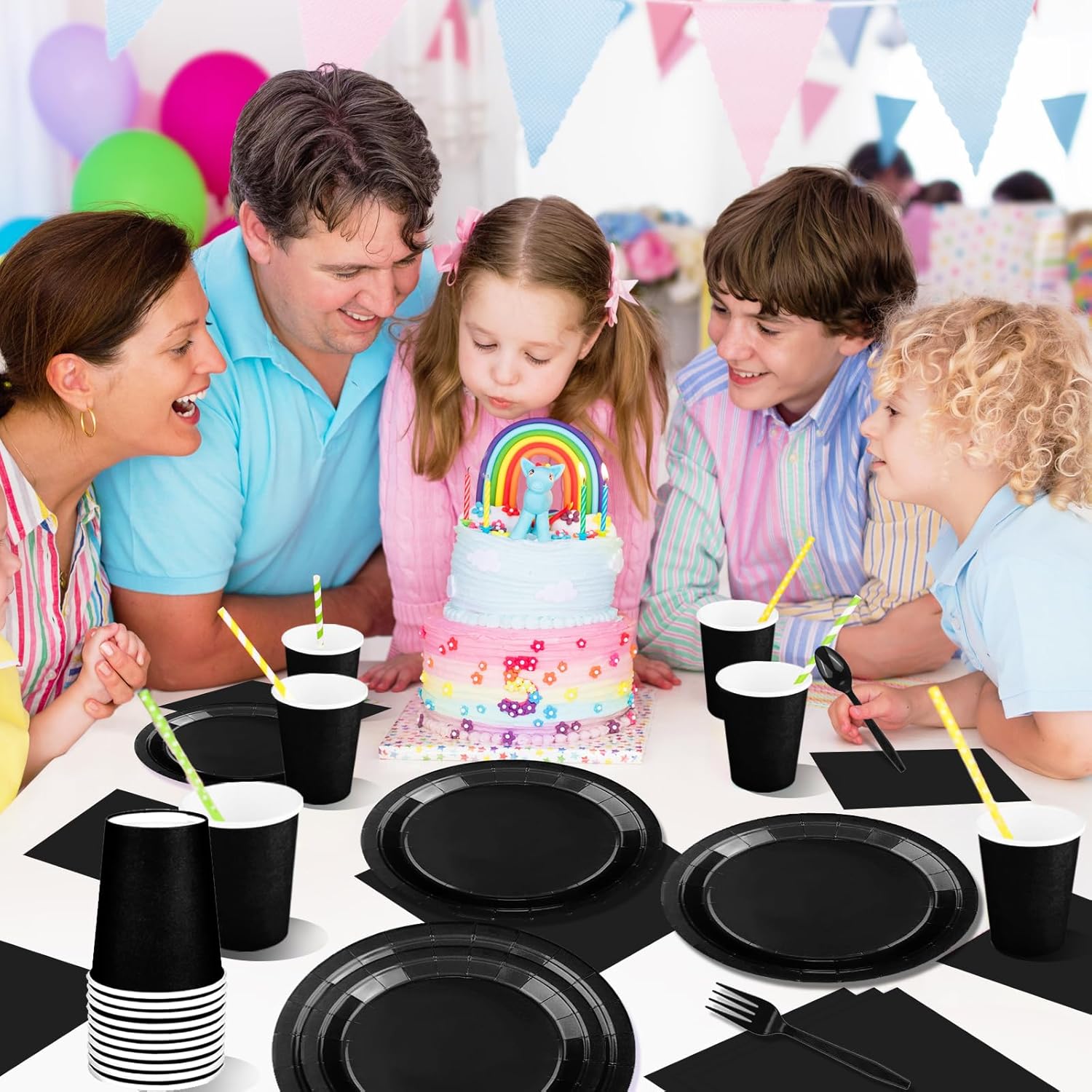 • Black Party Supply Set: The black party supply set with 30 each of 9 inch black paper plate, 7 inch party paper plates, 9 oz paper cups, plastic forks, spoons, knives, and 48 pieces paper napkins, party plates set ensures your table is ready for party